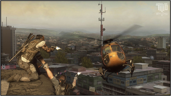 After this you are told you need to help some guys on the roof and your next objective becomes to clear it out.  One person steps up into the helicopter while the other stays on the ground (Preferably the guy who picked up the SAW+Shield).  While you are in the helicopter it is similar to the Chopper Gunner kill streak from Call of Duty: Modern Warfare 2, including the little diamond shape that appears around enemies.  After a brief second of running while your team mate provides fire, the person on the ground will need to take out a guy with an RPG so he does not shoot down your support chopper.  In turn, after that is finished, the person in the heli must shoot down an antenna so you may cross to another roof top, but a rival helicopter shoots down your friends chopper in the process of you crossing.  Quickly running forward you grab your friend just before his helicopter falls off with him still in it; before you can pull him up though, the enemy helicopter comes back around with plans to kill you both.  Quickly you both use your free hands to grab your pistol, kill the helicopter pilot, and soon you pull your comrade-in-arms to safety.  However, the helicopter is now spiraling out of control, crashing back into the roof top, exploding, and sending its blade right at you two (And this is where the demo ends as they both say “SHIT!”).
