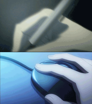 The first one happens to be the reason I posted her holding the card above, it is “Crypt Ghast” from Magic the Gathering. I noticed when Tomoko went to the card game tournament it looked strangely familiar, come to find out it was exactly what I expected (Me and my friends play Magic, so that was very cool). I even noticed that when she is looking up how to be popular on her computer late at night, she begins to move the mouse rapidly around, just like Yagami Light does when he is writing names in the death note during Death Note (Not the gif to the left of this paragraph). Even on facebook just the other day my friend Mionca commented that she had found a reference to Hayao Miyazai’s “Whisper of the Heart” (Funny enough, it is actually the day dream of her and the obese guy in art class I was talking about earlier). I am quite sure there are many others once you begin to analyze things and pay close attention to the details, but even just these three alone are sufficient for a whole new level of awesome.