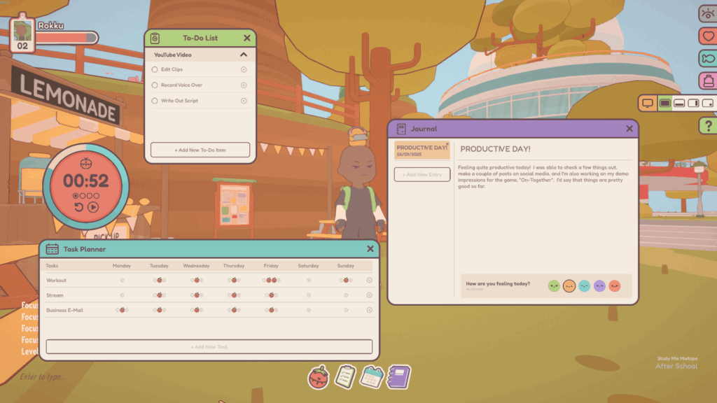 I think some small additions would make it even better, such as Task Planner being more fleshed out, saying what emotions the emoticons mean in the journal, and also disabling V-Sync as the default rather than having it on. Also, I think there should be an icon to easily turn music on/off. However, so far so good, and I am looking forward to what GigaPuff has in store with this game!