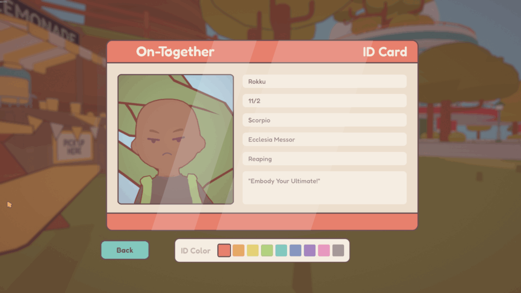 You’re able to make a small ID for yourself after all of this. It features the avatar you’ve made, including some information you get to fill out: Name, Birthday, Horoscope, Location, Area of Study, and your Favorite Quote. I think this is pretty self-explanatory, but it’s a very cool feature for social purposes. Meeting someone and having a small peek at them is always welcomed.