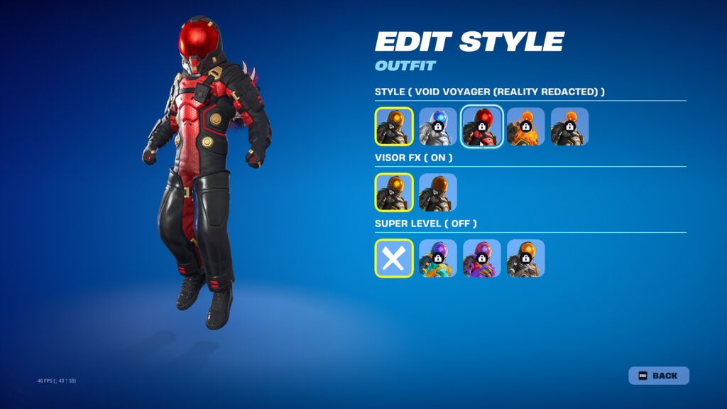 More-often-than-not, Fortnite has followed this particular style of skin editing. You’d have different selectable styles present, the ability to toggle on or off different aspects of the costume or effects, and finally you’d have all the available colors to apply to any of the styles.